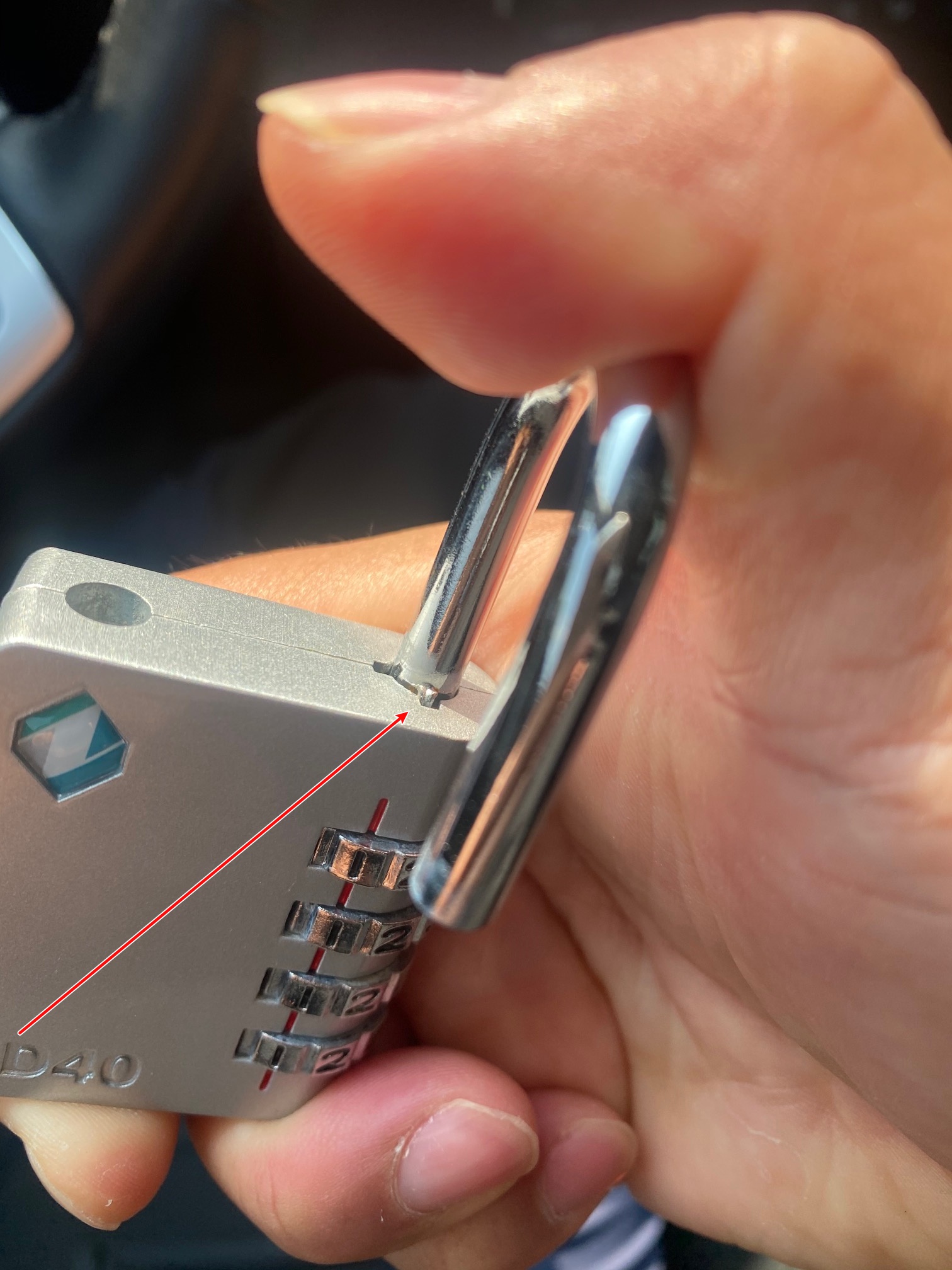 2. 기존의 비밀번호를 그대로 둔채 열쇠고리 중 축에 해당되는 부분을 보면, 6시 방향으로 홈이 파져 있고 또, 열쇠고리에 그 홈에 들어갈 수 있을 정도에 튀어 나온 부분이 있다.
